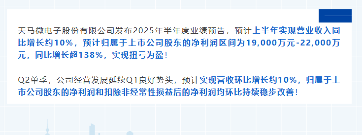 天馬微電子股份有限公司發(fā)布2025年半年度業(yè)績(jī)預(yù)告,預(yù)計(jì)上半年實(shí)現(xiàn)營(yíng)業(yè)收入同比增長(zhǎng)約10%,預(yù)計(jì)歸屬于上市公司股東的凈利潤(rùn)區(qū)間為19,000萬(wàn)元-22,000萬(wàn)元,同比增長(zhǎng)超138%,實(shí)現(xiàn)扭虧為盈!Q2